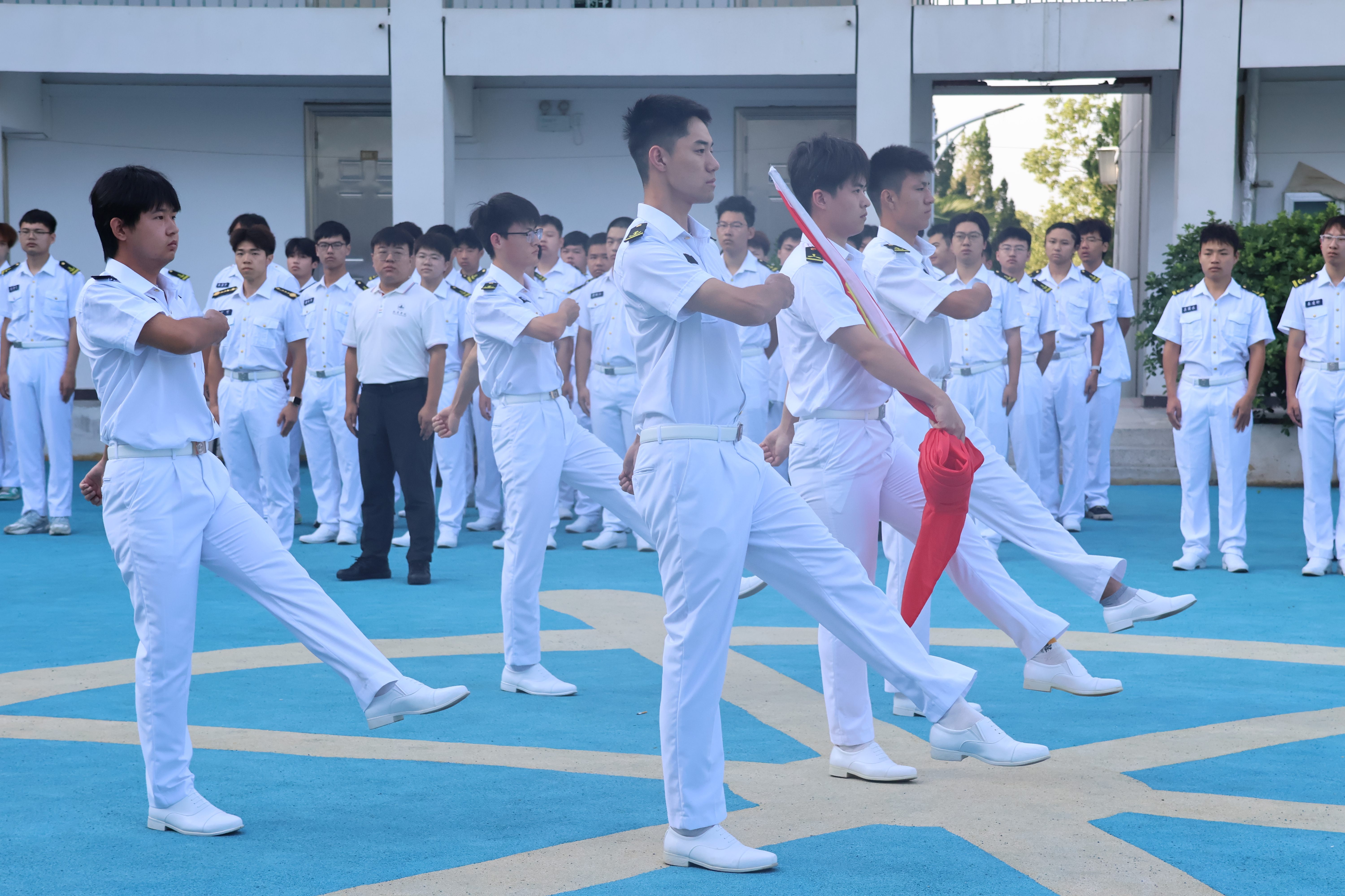 6时55分,随着一声“升旗仪式现在开始”,国旗仪仗队护卫着鲜艳的五星红旗入场。在激昂的国歌奏响声中,五星红旗冉冉升起,全体师生庄严肃立,行注目礼,齐唱国歌。朝阳映照下,鲜艳的国旗与同学们青春的面庞交相辉映,爱国情怀与对航海事业的责任担当在心中激荡。