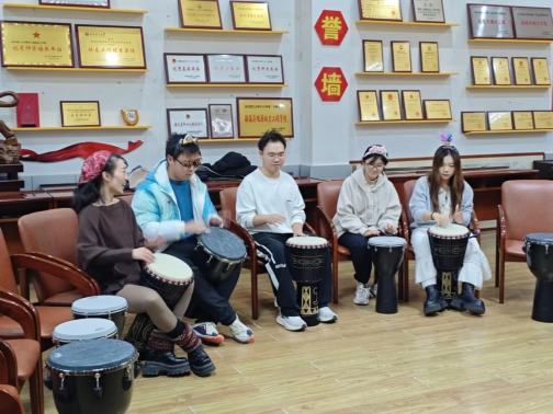 本次活动以鼓圈游戏为核心,融合音乐治疗与团体协作理念,旨在通过节奏互动帮助同学们释放压力、觉察自我、增强团队凝聚力。陈珺瑾老师现场指导带领同学们熟悉打击乐器,学习基础节奏,并通过“击鼓传花”“主题律动创编”等互动环节,引导参与者自由表达、合作共创,营造了一个开放、包容、有感染力的音乐空间。此次鼓圈活动不仅丰富了同学们的课余生活,更在轻松愉悦的氛围中传递了心理健康理念,增强了同学们对自我情绪的觉察与调节能力。现场秩序井然,参与同学热情高涨,纷纷表示在鼓声与节奏中感受到了情绪的释放与心灵的共鸣。