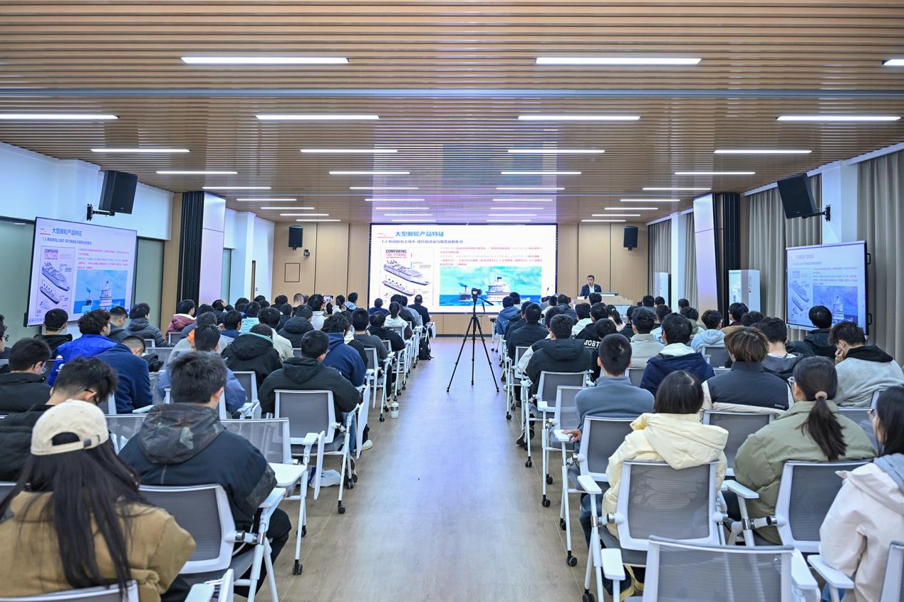 “大型邮轮被誉为‘造船工业皇冠上的明珠’,其设计建造涵盖数十个专业领域,代表一个国家装备制造和综合科技水平。”陈刚在报告中指出,中国船舶工业正迎来高质量发展的关键期。互动环节,他深情寄语在场学子,“船舶行业的发展离不开一代又一代人的接续奋斗,未来在你们手中,同学们要肩负起时代重任,深耕专业、勇于创新,为中国船舶工业的高质量发展添砖加瓦!”
